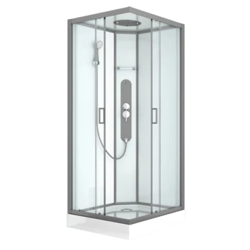 De Allibert douchecabine Uyuni 90×90 cm Hoekinstap is zeer eenvoudig te installeren met zijn clip-systeem en zonder boren, in 1 uur montage en zonder silicone. Deze complete douchecabine bestaat uit een douchetub in versterkt ABS, wanden en douchedeuren met anti-kalkbehandeling en een hoogwaardige kraan. De “minimalistische rechte” structuur is vervaardigd uit verchroomd aluminium. De deuren zijn transparant, de achterwanden in wit veiligheidsglas. Het gelakt zwart bedieningspaneel zorgt voor een perfecte afstelling van de waterhoeveelheid. De keuze is uitgebreid: hydromassagestralen, een handdouche met 3 functies, een zwart gelakt stalen douchekop van 25 x 25 cm geïntegreerd in het witte glazen dak.