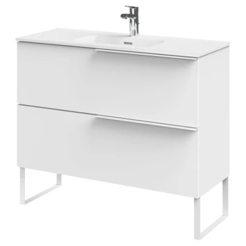 Haal het maximale uit je badkamer met deze wastafelonderkast in Scandinavische stijl. Het strakke design is simpel maar elegant. Deze slimme kast heeft een diepte van slechts 39 cm. Ideaal voor de kleinere badkamer. Dankzij haar effen lijnen laat hij de ruimte groter ogen. De ruime lades zijn uitgerust met Hettich softclosegeleiders en de binnenzijde heeft een trendy afwerking in textiel. De matwitte grepen zijn perfect in het geheel verwerkt, net als de twee speelse sierpoten. De luxueuse afwerking in hoogglans wit zorgt voor een frisse en ruimtelijke look.